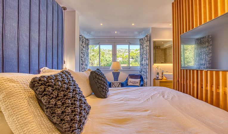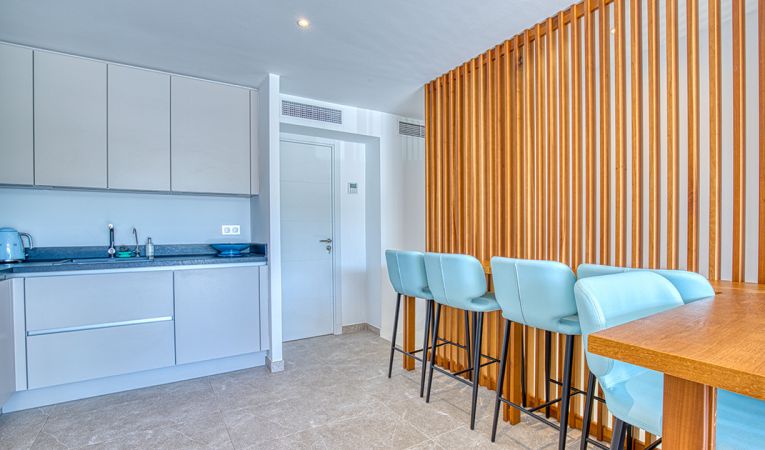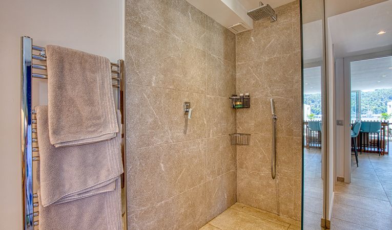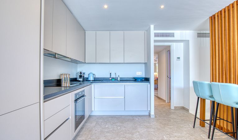 Interior amplio y soleado: El piso cuenta con tres dormitorios y dos baños en la planta baja, así como una terraza con acceso directo a la piscina. En la planta superior, hay un salón y una cocina de planta abierta, así como una suite principal con baño en suite. Disfrute de la luz natural que incide sobre las dos terrazas orientadas al sur y al sureste, desde las que podrá contemplar las vistas del puerto.